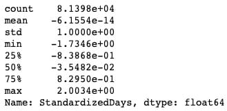 Section titled “Look at the new range”data_only_df[‘StandardizedDays’].describe()`