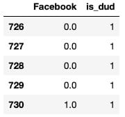 Section titled “Create target column using the function”fb_data_only_df[‘is_dud’] = fb_data_only_df[‘Facebook’].apply(dud_finder) fb_data_only_df[[‘Facebook’, ‘is_dud’]].head()`