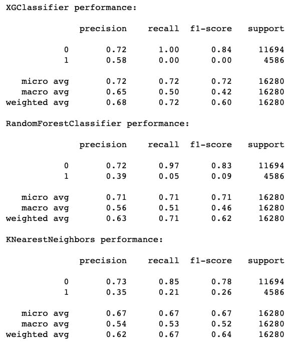 Section titled “Try xgc again with new params”xgc = xgb.XGBClassifier(random_state=10, **params) rfc = RandomForestClassifier(n_estimators=100, random_state=10) knn = KNeighborsClassifier() preds = {} for model_name, model in zip([‘XGClassifier’, ‘RandomForestClassifier’, ‘KNearestNeighbors’], [xgc, rfc, knn]): model.fit(X_train, y_train) preds[model_name] = model.predict(X_test)`