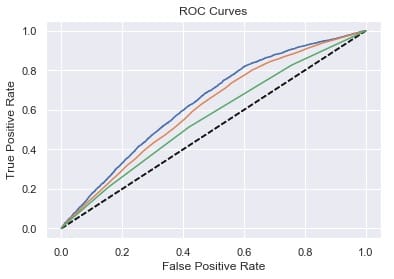plt.xlabel(‘False Positive Rate’) plt.ylabel(‘True Positive Rate’) plt.title(‘ROC Curves’) plt.show()`