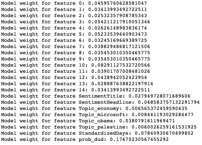 整齐!我们的模型被发现prob_dud是最重要的功能,我们的自定义StandardizedDays功能是第二重要的功能。(特征0到14对应于缩小的标题嵌入向量。)