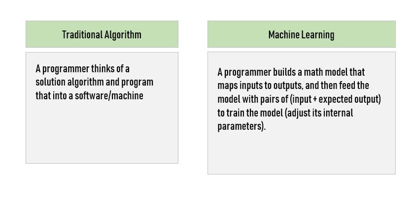 传统算法基于算法中描述的步骤产生输出。给出算法输入,它根据您自己硬编码的规则和参数生成输出****。