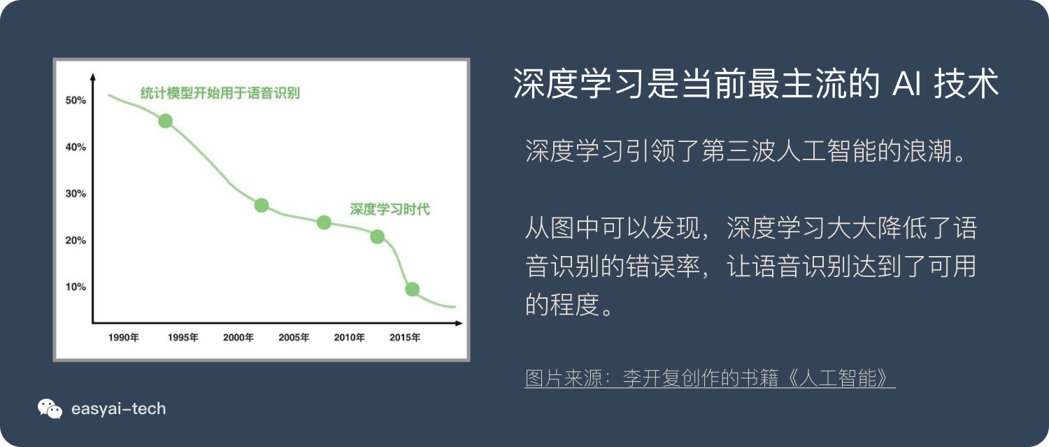 在各种条件成熟后,深度学习发挥出了强大的能力。在语音识别、图像识别、NLP等领域不断刷新纪录。让 AI 产品真正达到了可用(例如语音识别的错误率只有6%,人脸识别的准确率超过人类,BERT在11项表现中超过人类…)的阶段。