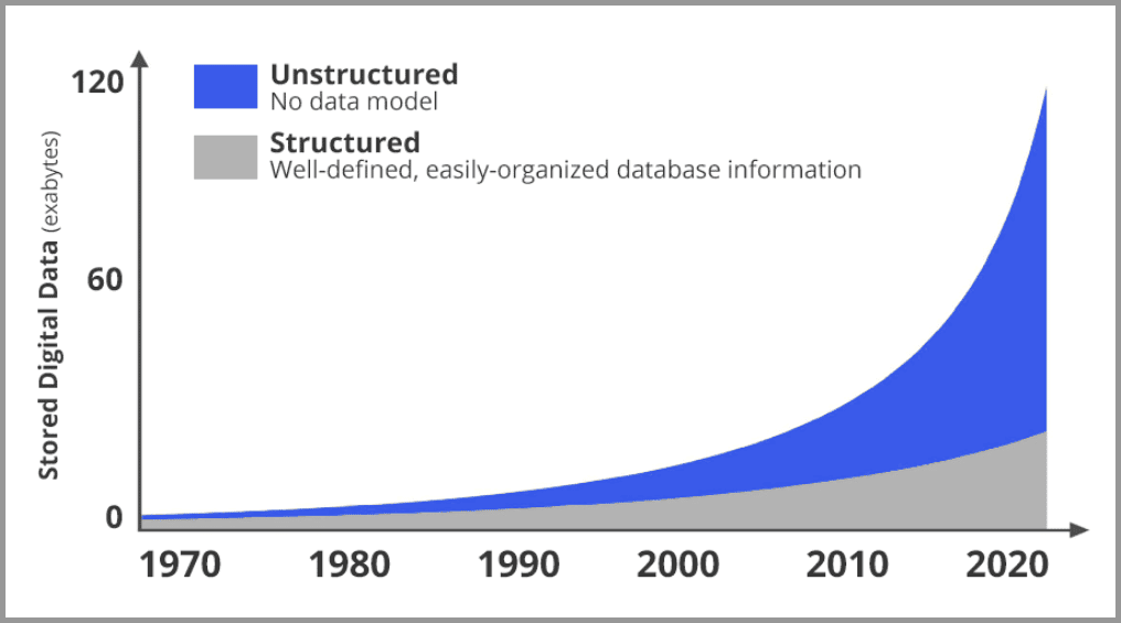 下图是网络上新增数据的占比趋势图。灰色是结构化数据,蓝色是非结构化数据(大部分都是图像和视频)。可以很明显的发现,图片和视频正在以指数级的速度在增长。