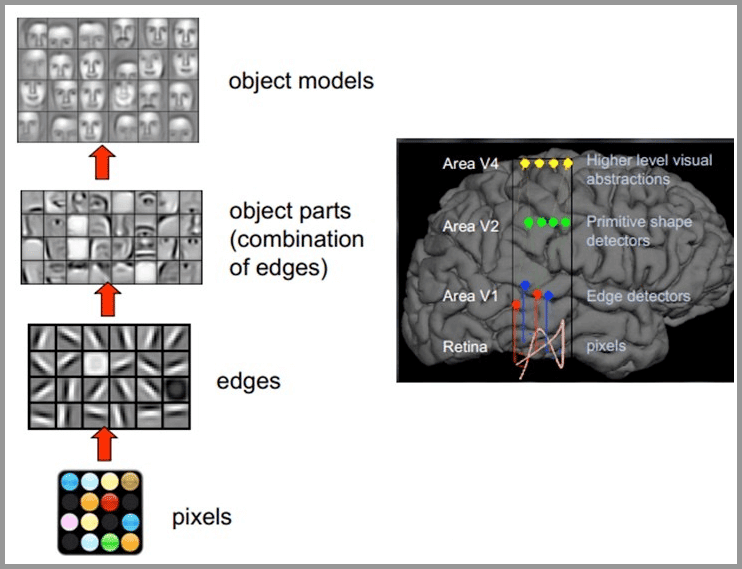 人类的视觉原理如下:从原始信号摄入开始(瞳孔摄入像素 Pixels),接着做初步处理(大脑皮层某些细胞发现边缘和方向),然后抽象(大脑判定,眼前的物体的形状,是圆形的),然后进一步抽象(大脑进一步判定该物体是只气球)。