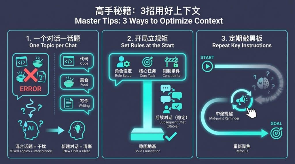 - 错误做法: 上一秒让AI写代码,下一秒问它红烧肉怎么做,接着又让它翻译论文。这会导致“小抄”里充满了无关信息,干扰AI判断。
