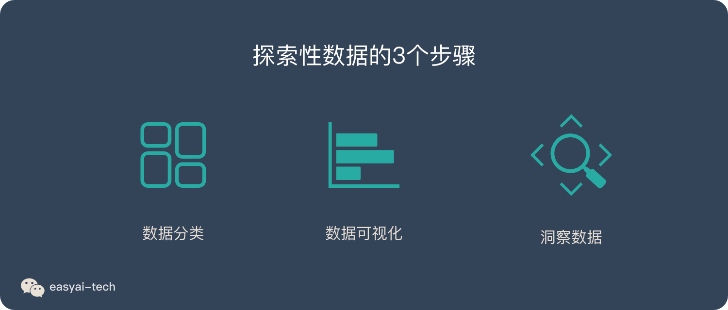 探索性数据分析就是利用各种技术手段(大部分都是利用数据可视化)探索数据内部结构和规律的一种数据分析方法和理念。 探索性数据分析的过程大致分为3步:
