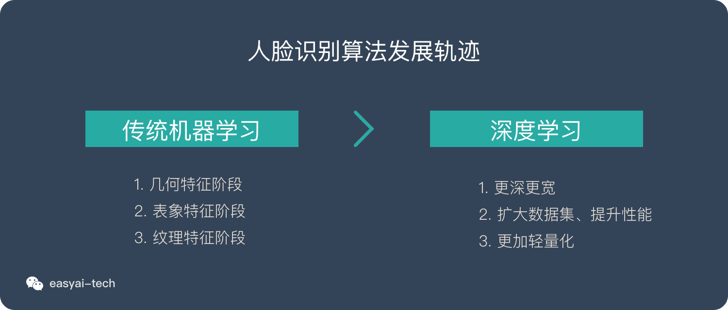 Section titled “人脸识别算法的发展轨迹”人脸识别领域,也是从传统机器学习算法过度到深度学习算法的。