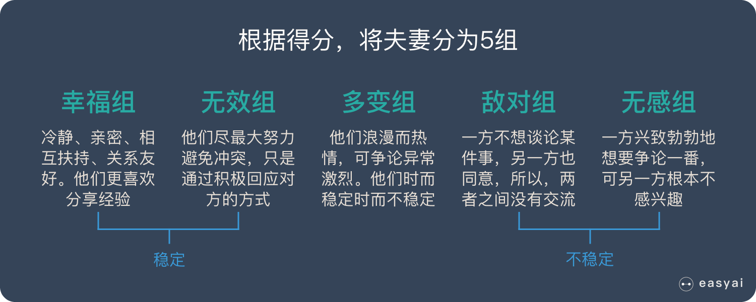 戈特曼根据得分,将这些夫妻分成5组: