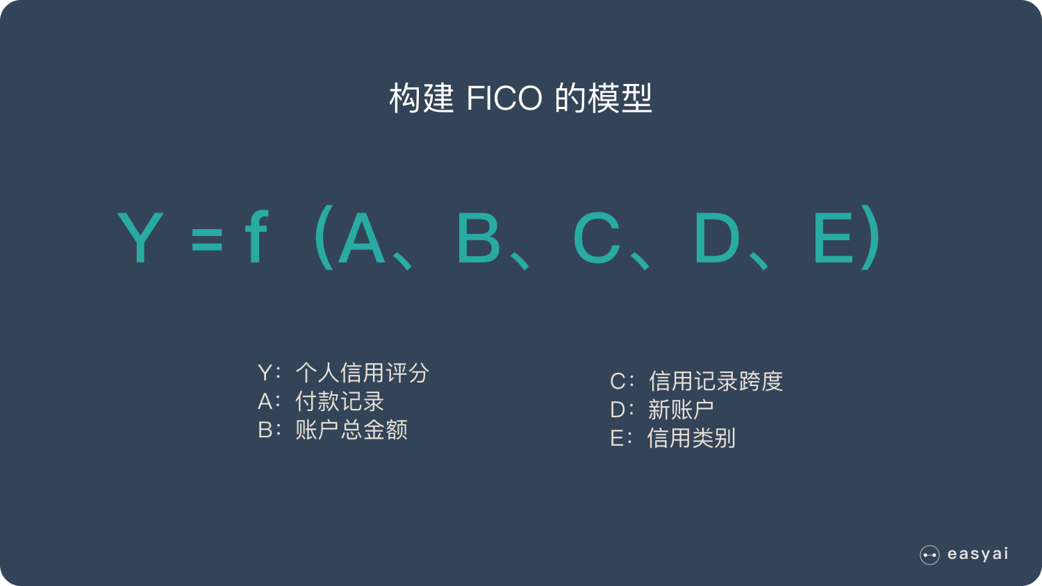 有了这些数据,我们通过机器学习,就能”猜测”出这5种数据和信用分数的关系。这个关系就是公式 f。