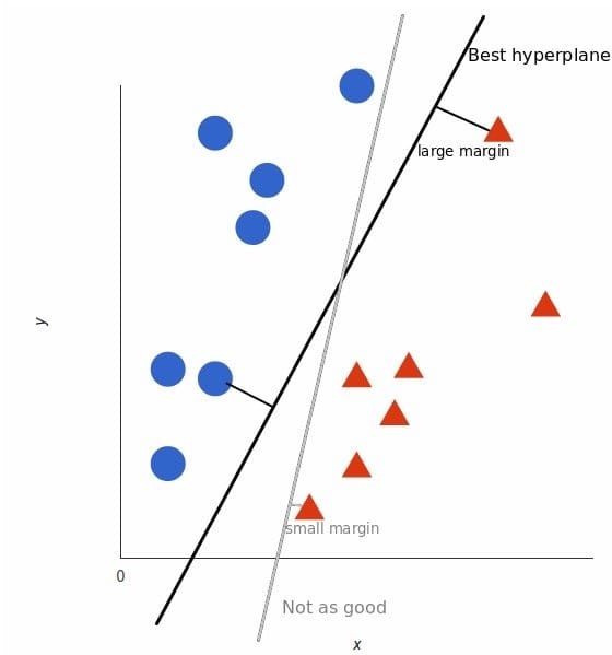 超平面与最近数据点之间的距离称为边距。可以将两个类分开的最佳或最佳超平面是具有最大边距的线。只有这些点与定义超平面和分类器的构造有关。这些点称为支持向量。它们支持或定义超平面。实际上,优化算法用于找到使裕度最大化的系数的值。