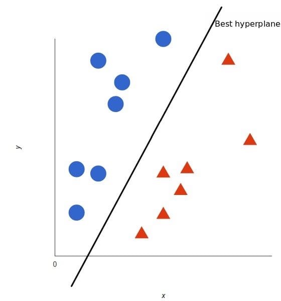 超平面是分割输入变量空间的线。在SVM中,选择超平面以最佳地将输入变量空间中的点与它们的类(0级或1级)分开。在二维中,您可以将其视为一条线,并假设我们的所有输入点都可以被这条线完全分开。SVM学习算法找到导致超平面最好地分离类的系数。