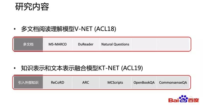 Section titled “4、百度阅读理解技术的研究工作”我会重点介绍百度面向搜索的多文档阅读理解上的研究工作V-NET,以及在引入外部知识阅读理解任务上的工作KT-NET,分别发表在去年和今年的ACL上。