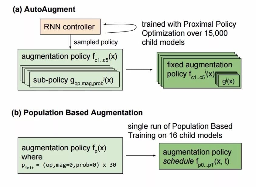 研究人员从DeepMind的Population Based Training算法中借鉴了一些思想,并将其应用在了数据增强策略的生成上,将训练中当前的结果作为生成策略的基础,使得训练的结果可以在不同子模型中共享,避免耗时的重复训练。