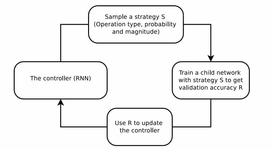 这篇论文利用了强化学习等方法来搜索更好的数据增强策略,基于RNN的控制器从搜索空间中预测增强策略,而一个固定架构的子网络则用于在增强的数据上进行训练收敛到精度R,最后利用精度R来作为奖励使得控制器寻求更好的数据增强策略。